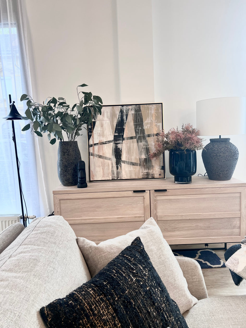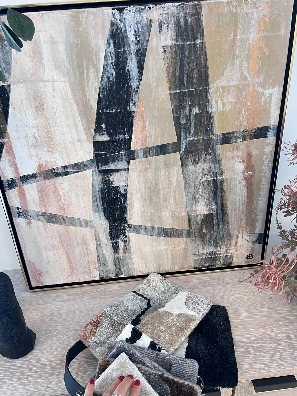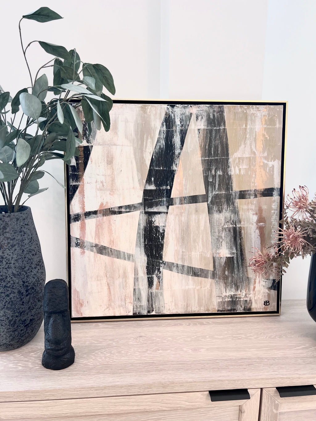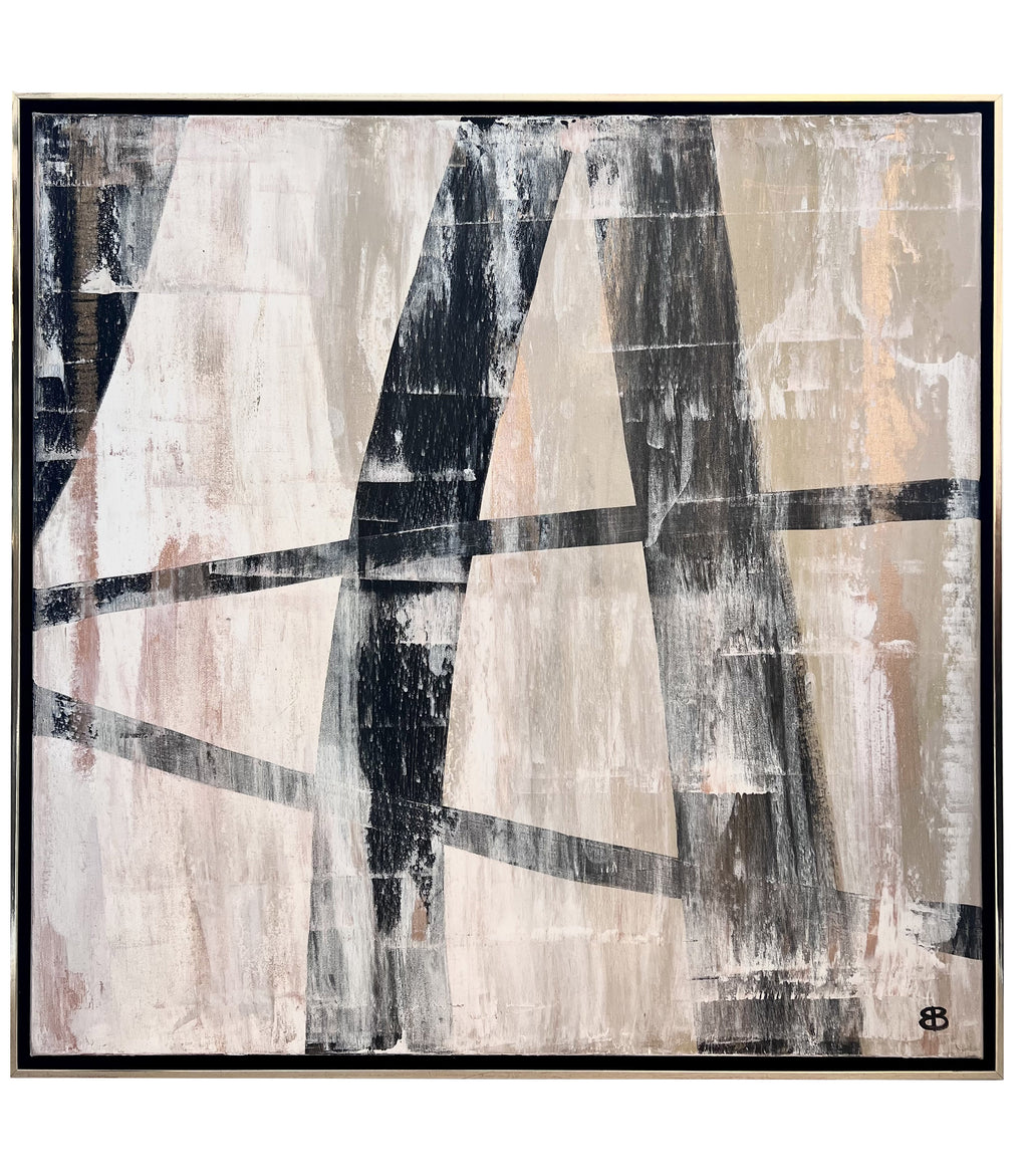 Ez az impozáns kézzel festett modern festmény egy teljesen egyedi darab. A művész a "Bizonyosság" címet adta a képnek, amely a fátyolos ecsetvonások alól felsejlő határozott fekete geometriákban tükröződik. Absztrakt formáival minden térben jól mutat. Mivel műalkotás, személyre szabva készül nincs két ugyan olyan darab.