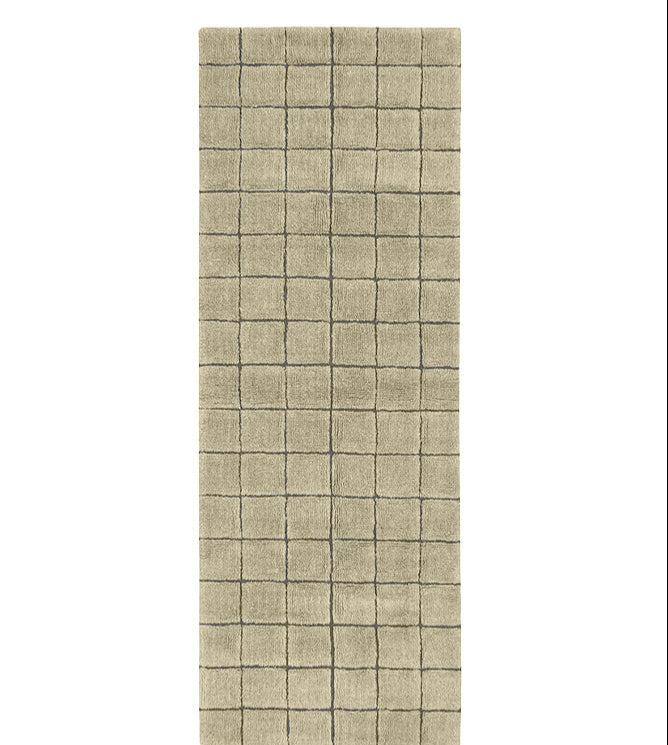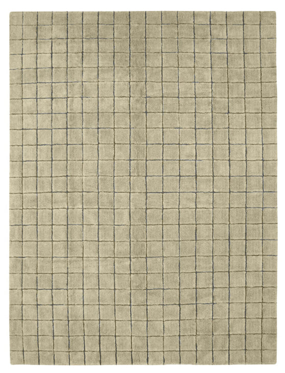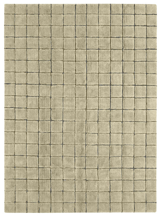 A klasszikus mozaikok ihlette szőnyeg egy kockás mintát mutat be zöld színben.